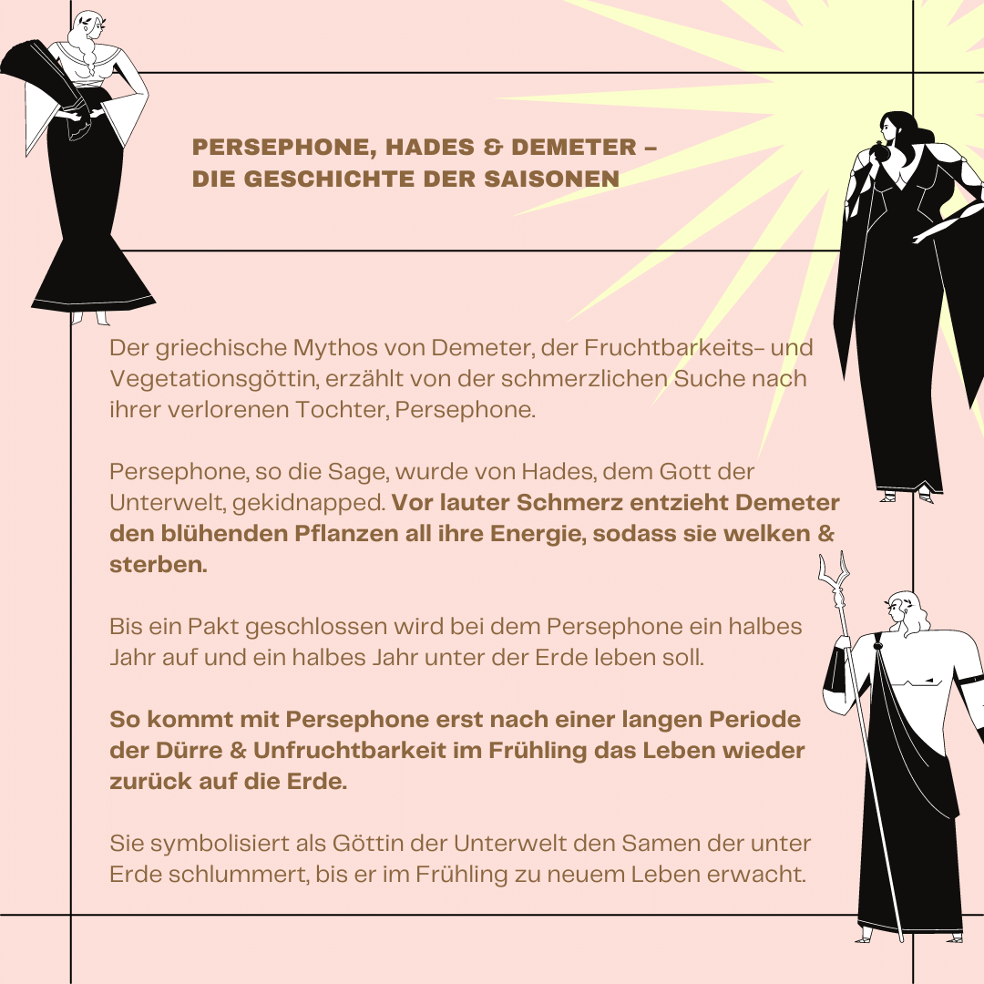 So kommt mit Persephone erst nach einer langen Periode der Dürre & Unfruchtbarkeit im Frühling das Leben wieder zurück auf die Erde. Sie symbolisiert als Göttin der Unterwelt den Samen der unter Erde schlummert, bis er im Frühling zu neuem Leben erwacht.
